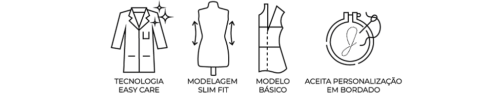 O Jaleco Dinamic é confeccionado em Gabardine (Bi Stretch), tecido, 100% poliéster com estrutura firme, caimento elegante e alta durabilidade para o uso diário.